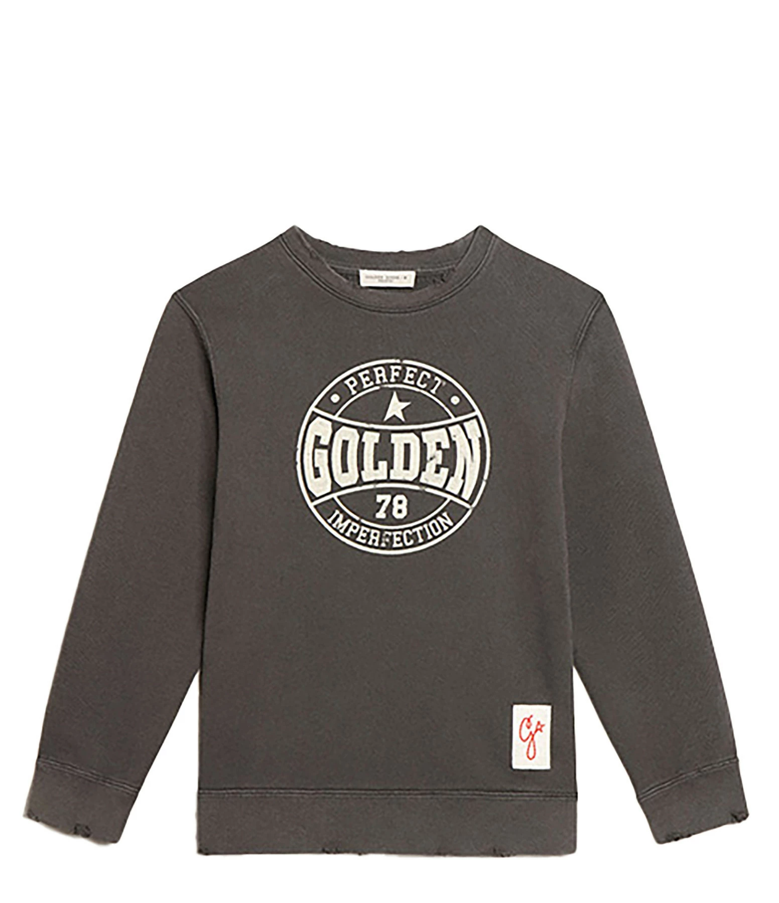 Sweatshirt en coton molletonné gris anthracite avec l’inscription “Golden Perfect imperfection 78” flockée en blanc sur le devant. Col rond côtelé. Manches longues avec poignets côtelés. Patch avec la lettre G brodée en rouge sur le devant. Coupe droite. Base droite côtelée. Effets usés et déchirés par endroits.
