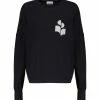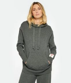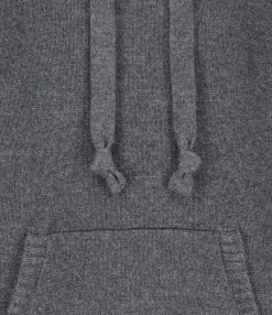 Sweatshirt en tricot de cachemire et laine gris. Col à capuche avec cordon de serrage. Manches longues avec poignets côtelés. Patch amovible avec la lettre G brodée en rouge sur le poignet gauche. Une poche kangourou sur le devant. double logo étoile en métal bronze dans la nuque. Coupe ample. Base droite côtelée.
