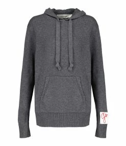 Sweatshirt en tricot de cachemire et laine gris. Col à capuche avec cordon de serrage. Manches longues avec poignets côtelés. Patch amovible avec la lettre G brodée en rouge sur le poignet gauche. Une poche kangourou sur le devant. double logo étoile en métal bronze dans la nuque. Coupe ample. Base droite côtelée.