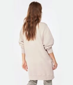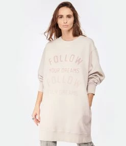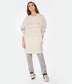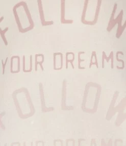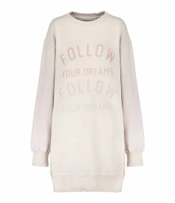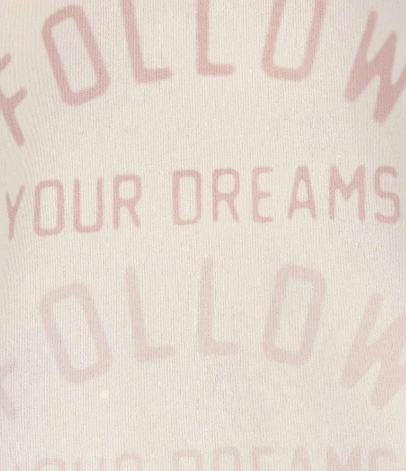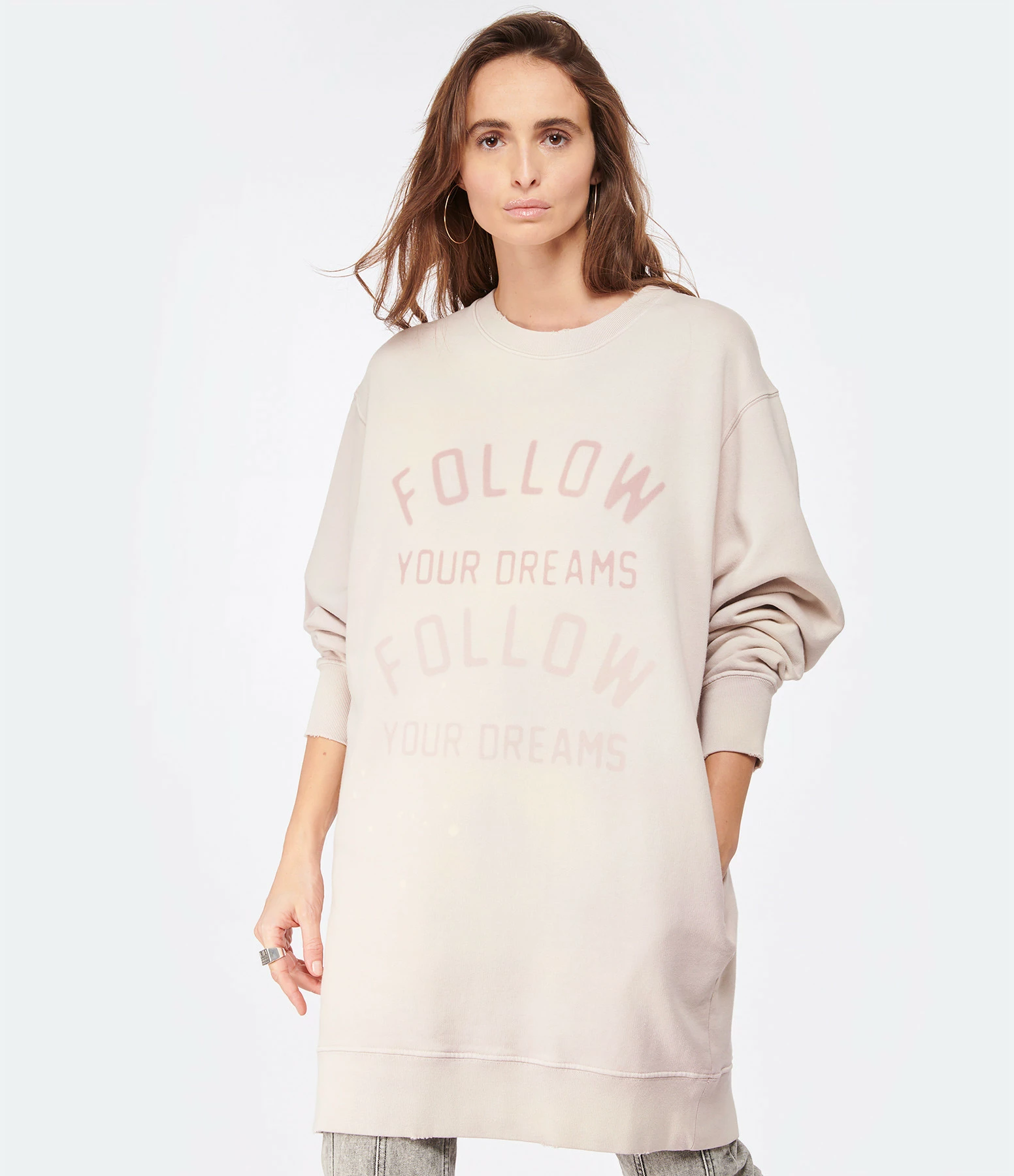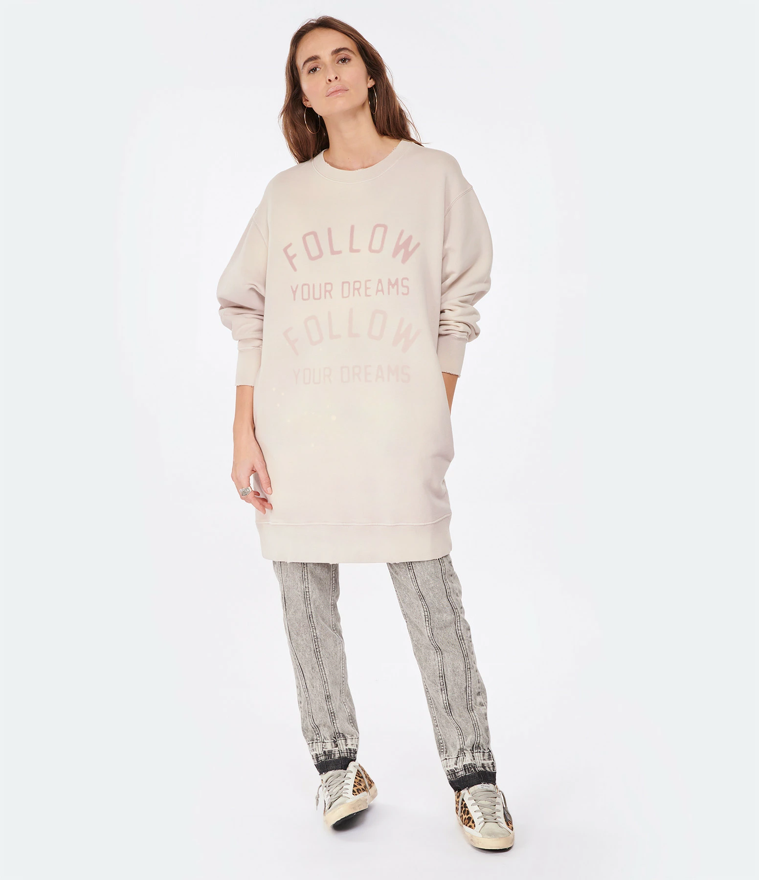 Sweatshirt en coton molletonné rose avec l’inscription “Follow Your Dreams” imprimée en rose contrastant sur le devant. Col rond côtelé. Manches longues avec poignets côtelés. Deux poches prises dans les coutures latérales sur le devant. Double logo étoile en métal bronze dans la nuque. Coupe ample. Base droite côtelée. Effets usés et déchirés par endroits.