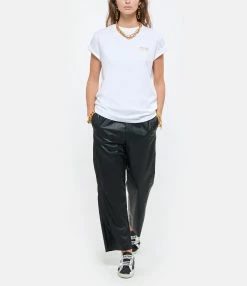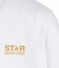 Tee-shirt en coton blanc avec inscription à paillettes dorées sur la poitrine, et étoile dans le dos. Col rond. Manches courtes. Coupe droite. Base droite.