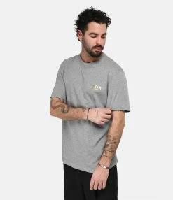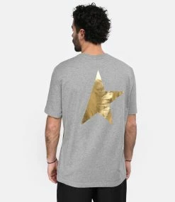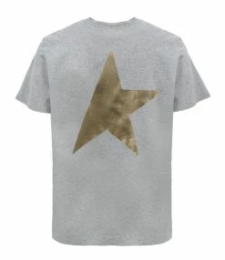 Tee-shirt en coton gris chiné. Inscription poitrine “STAR GOLDEN GOOSE” sérigraphiée en doré. Logo “étoile” sérigraphié en doré au dos. Col rond côtelé. Manches courtes. Coupe droite. Base droite.