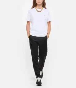 Tee-shirt en coton blanc avec étoile à paillettes argenté sur la poitrine. Col rond. Manches courtes. Coupe droite. Base droite.