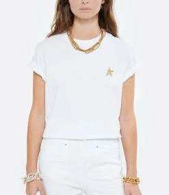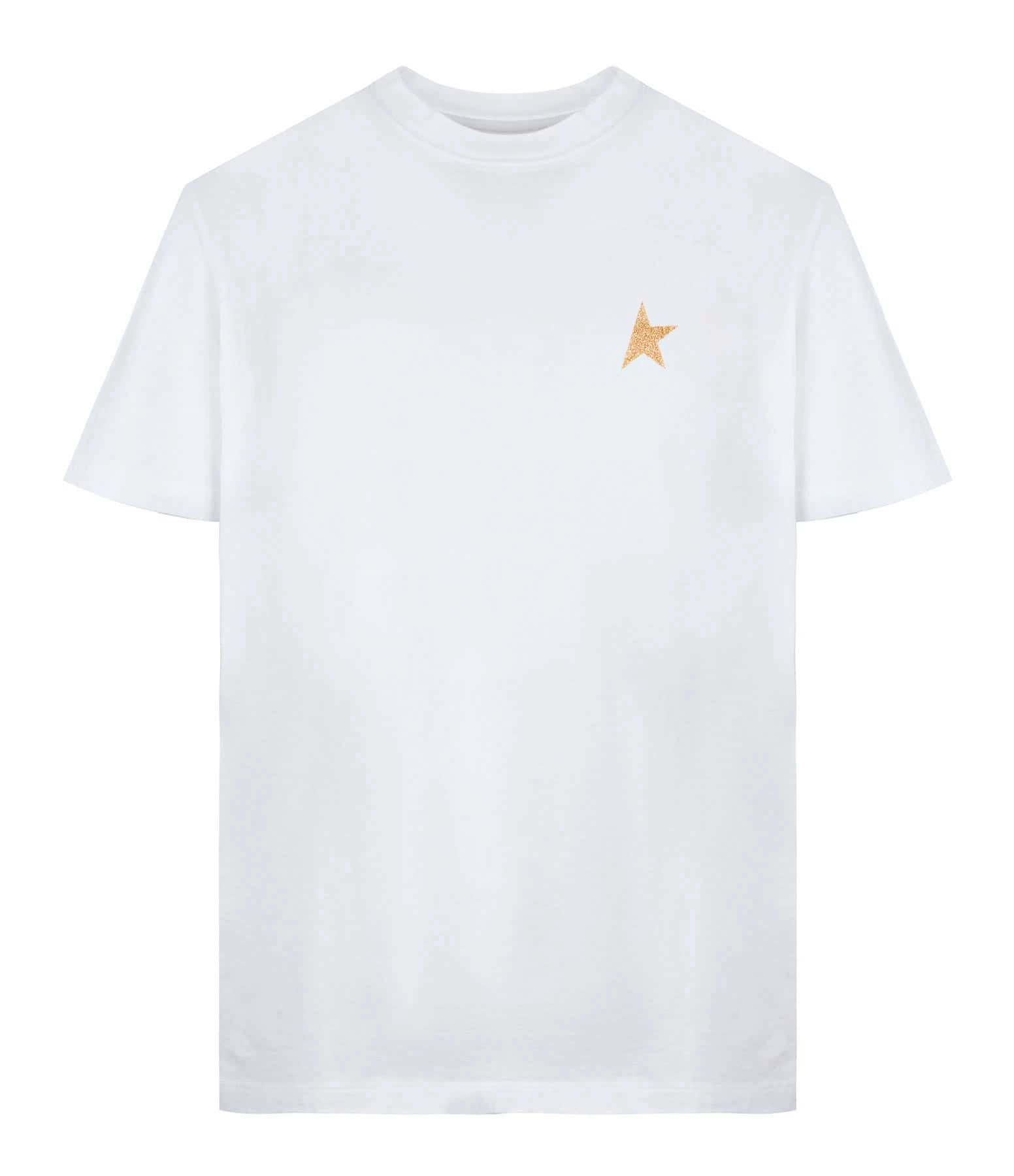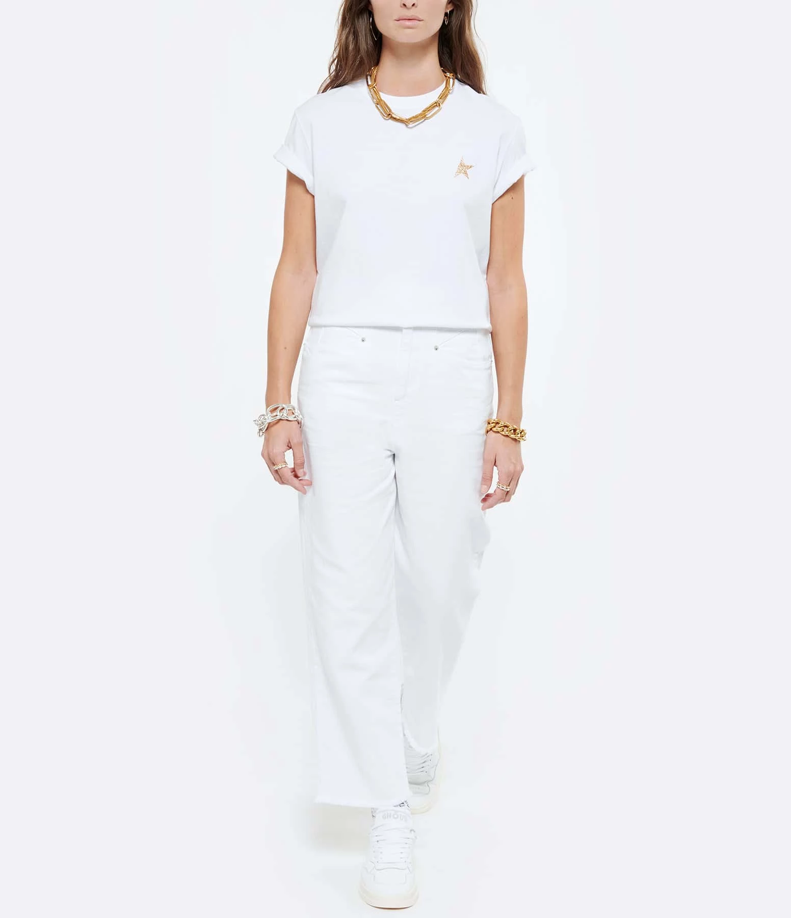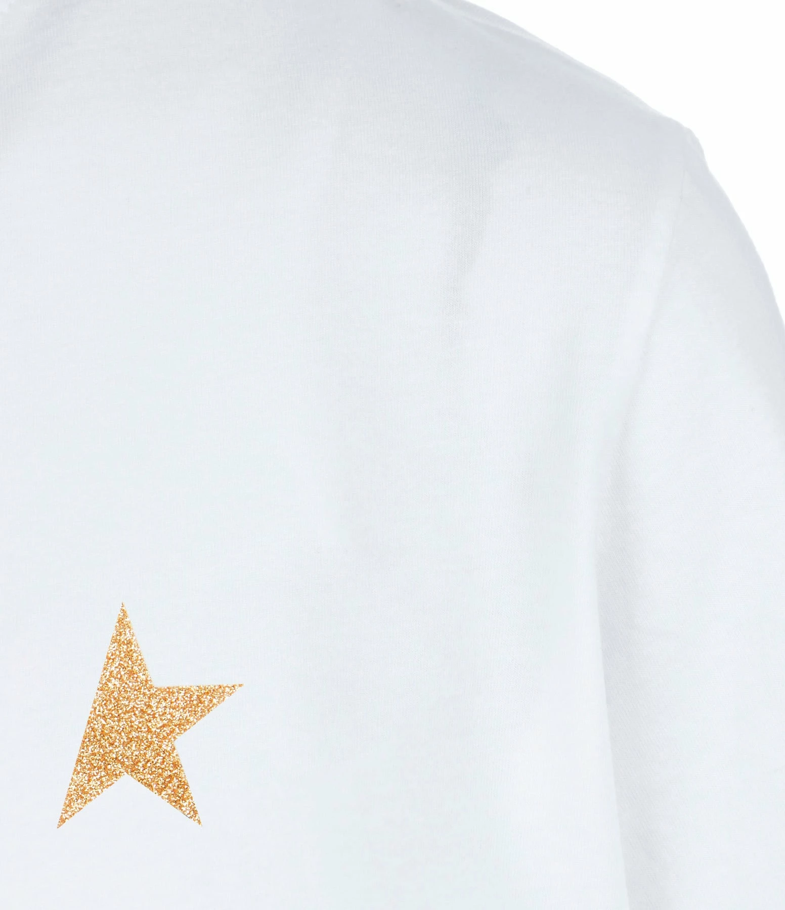 Tee-shirt en coton blanc avec étoile à paillettes dorées sur la poitrine. Col rond. Manches courtes. Coupe droite. Base droite.