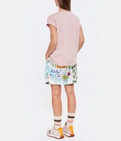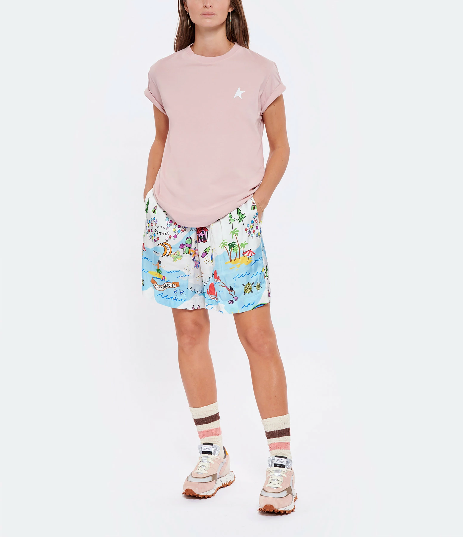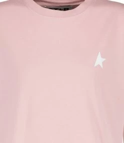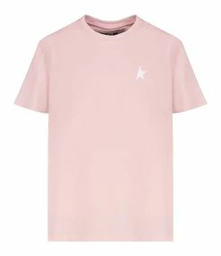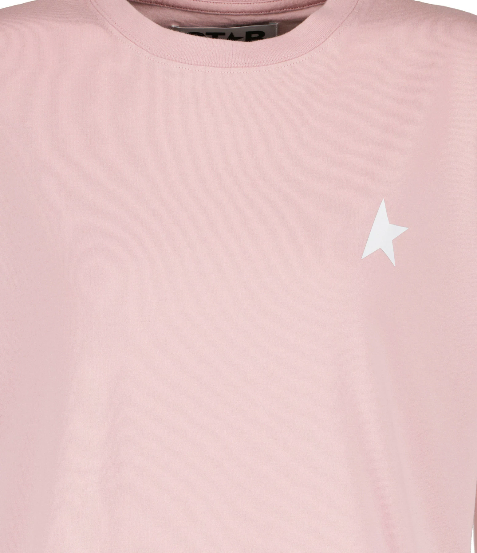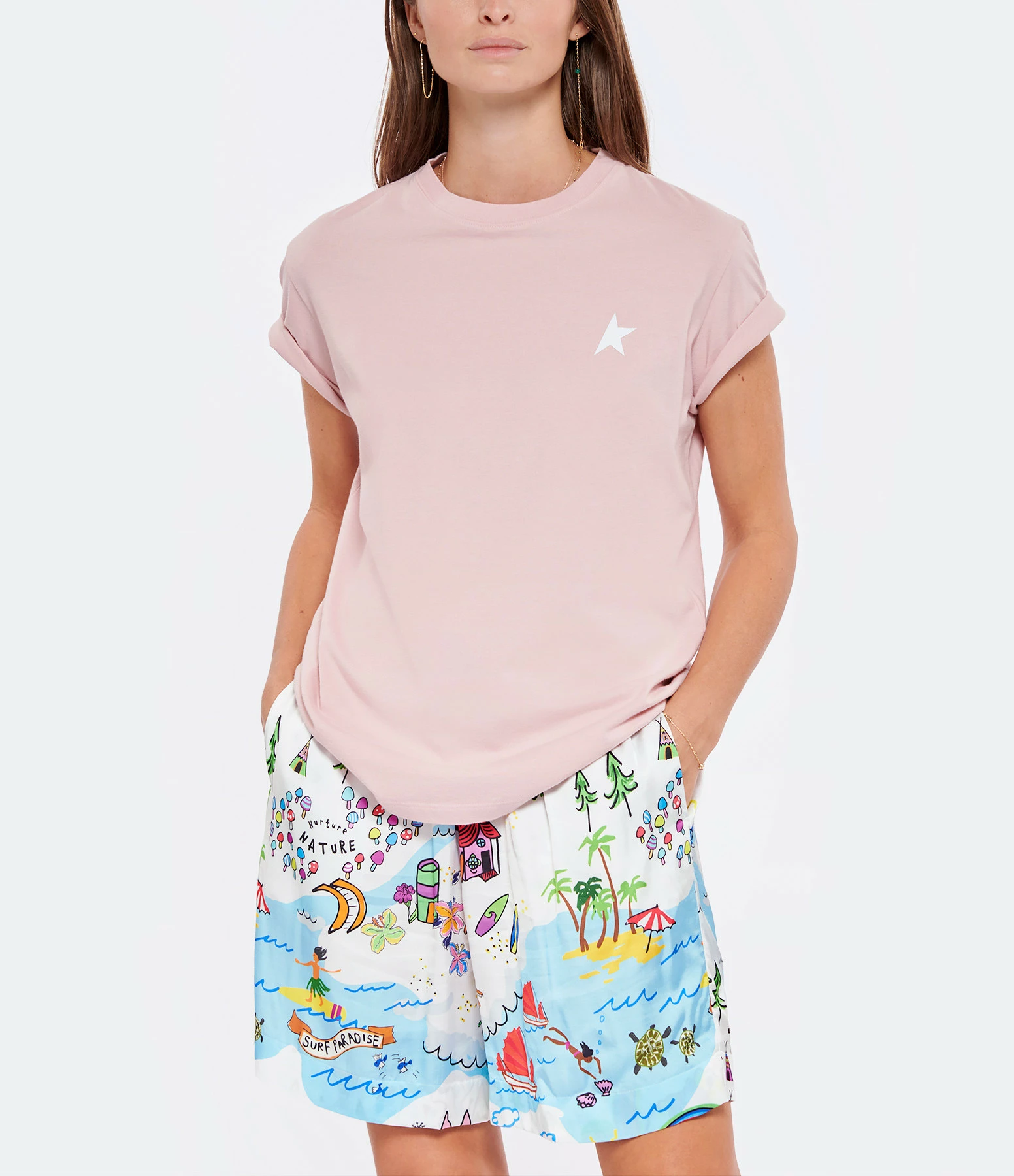 Tee-shirt en coton rose. Sérigraphie logo “étoile” blanche sur la poitrine. Col rond côtelé. Manches courtes. Coupe droite large. Base droite. Non doublé.