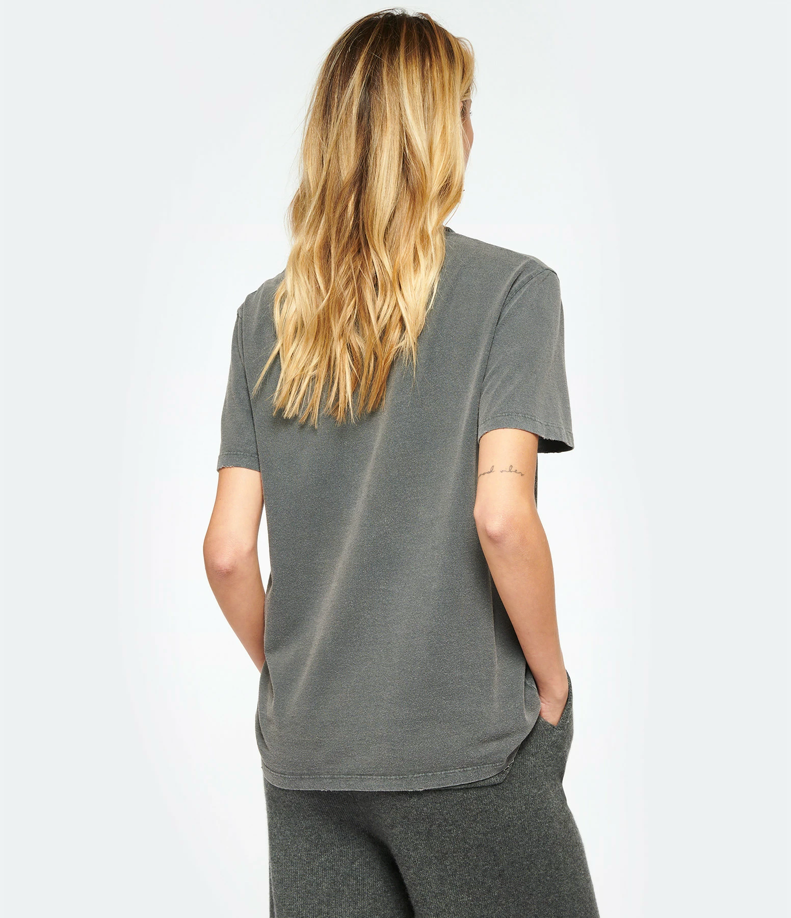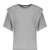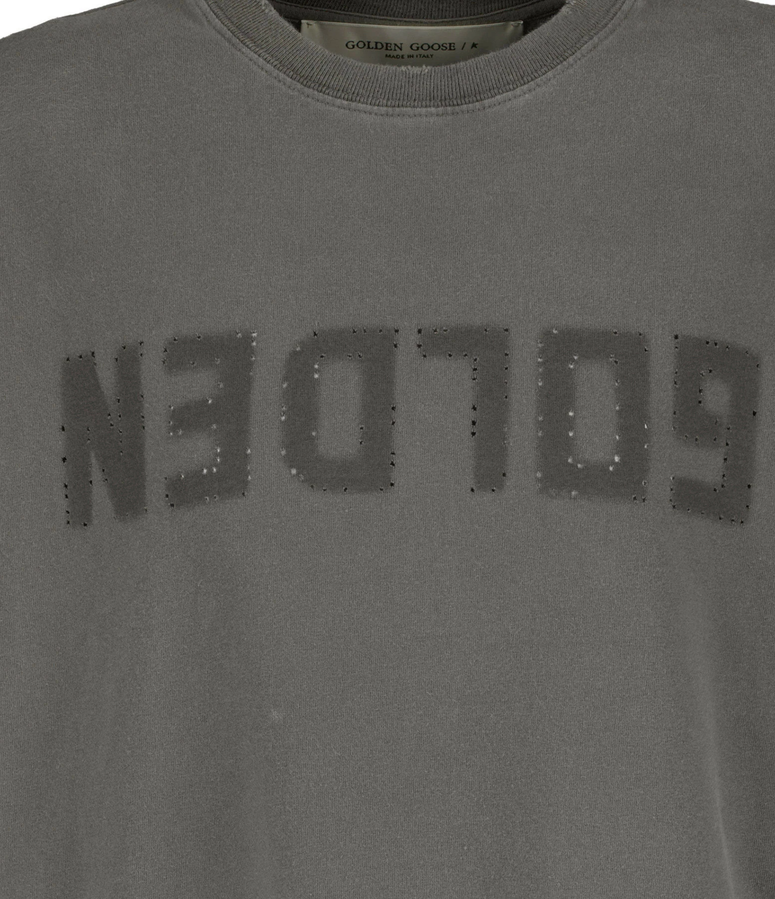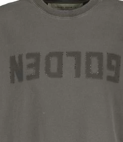 Tee-shirt en coton gris. Col rond. Manches courtes. Inscription “GOLDEN” à l’envers imprimée ton sur ton sur l’avant , avec effet troué. Pièce amovible blanche avec lettre G rouge brodée. Double étoile en métal bronze dans le dos. Coupe droite. Base droite. Effet usé volontairement.