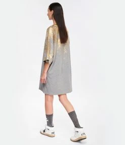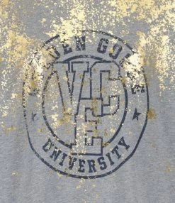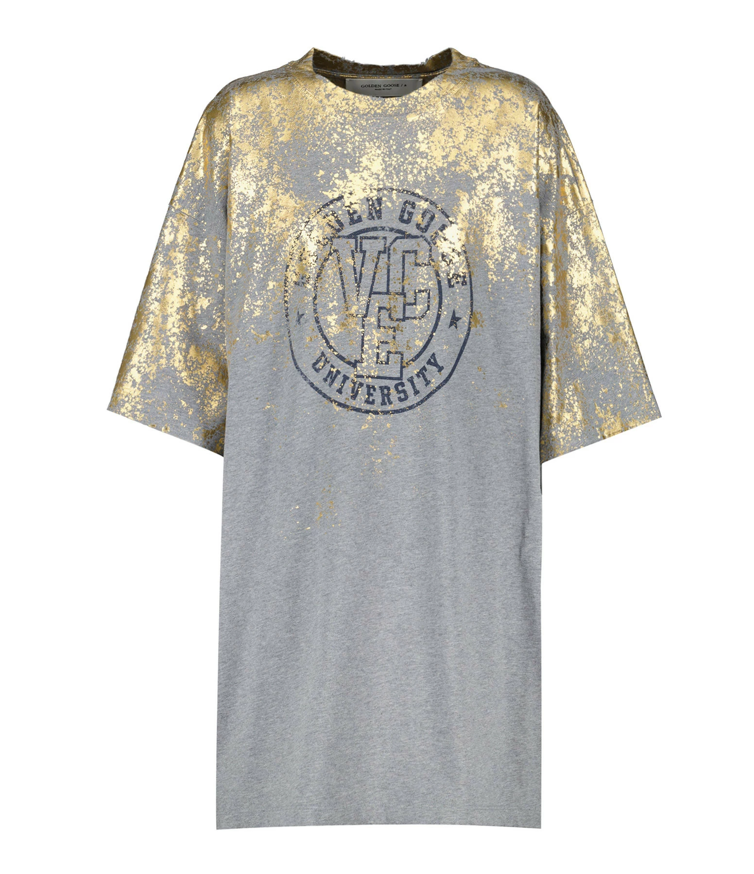 Long tee-shirt en jersey de coton gris chiné orné de dorure flockée et d’un imprimé “Golden Goose VEC University” en noir sur le devant. Col rond côtelé. Manches courtes. Double logo étoile en métal bronze. Coupe ample. Base droite. Effets usés et déchirés par endroits.