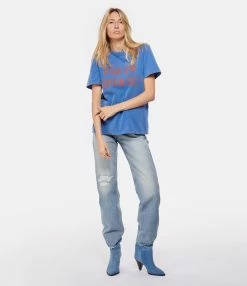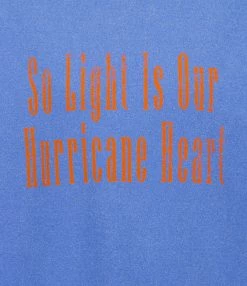 Tee-shirt en coton bleu avec l’inscription “So Light Is Our Hurricane Heart” imprimée en rouge sur le devant. Col rond côtelé. Manches courtes. Coupe droite. Base droite. Effet usé et déchiré par endroits.