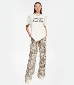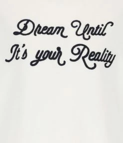 Tee-shirt en coton écru avec l’inscription “Dream Until It’s your Reality” brodée en noir sur le devant. Coutures soulignées par un surjet noir. Col rond côtelé. Manches courtes. Double logo étoile dans la nuque. Coupe droite. Base droite. Effet usé et déchiré par endroits.