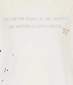 Tee-shirt en coton blanc cassé avec l’inscription “Seizing the beauty of the present and keeping it alive forever.” imprimée en noir et un cœur brodé en rouge sur le devant. Col rond côtelé. Manches courtes. Coupe droite. Base droite. Effets usés, déchirés et tachés par endroits.