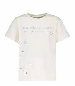Tee-shirt en coton blanc cassé avec l’inscription “Seizing the beauty of the present and keeping it alive forever.” imprimée en noir et un cœur brodé en rouge sur le devant. Col rond côtelé. Manches courtes. Coupe droite. Base droite. Effets usés, déchirés et tachés par endroits.