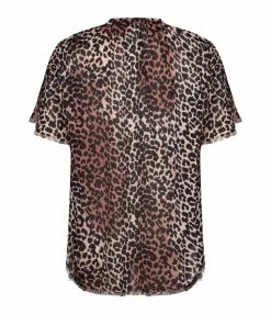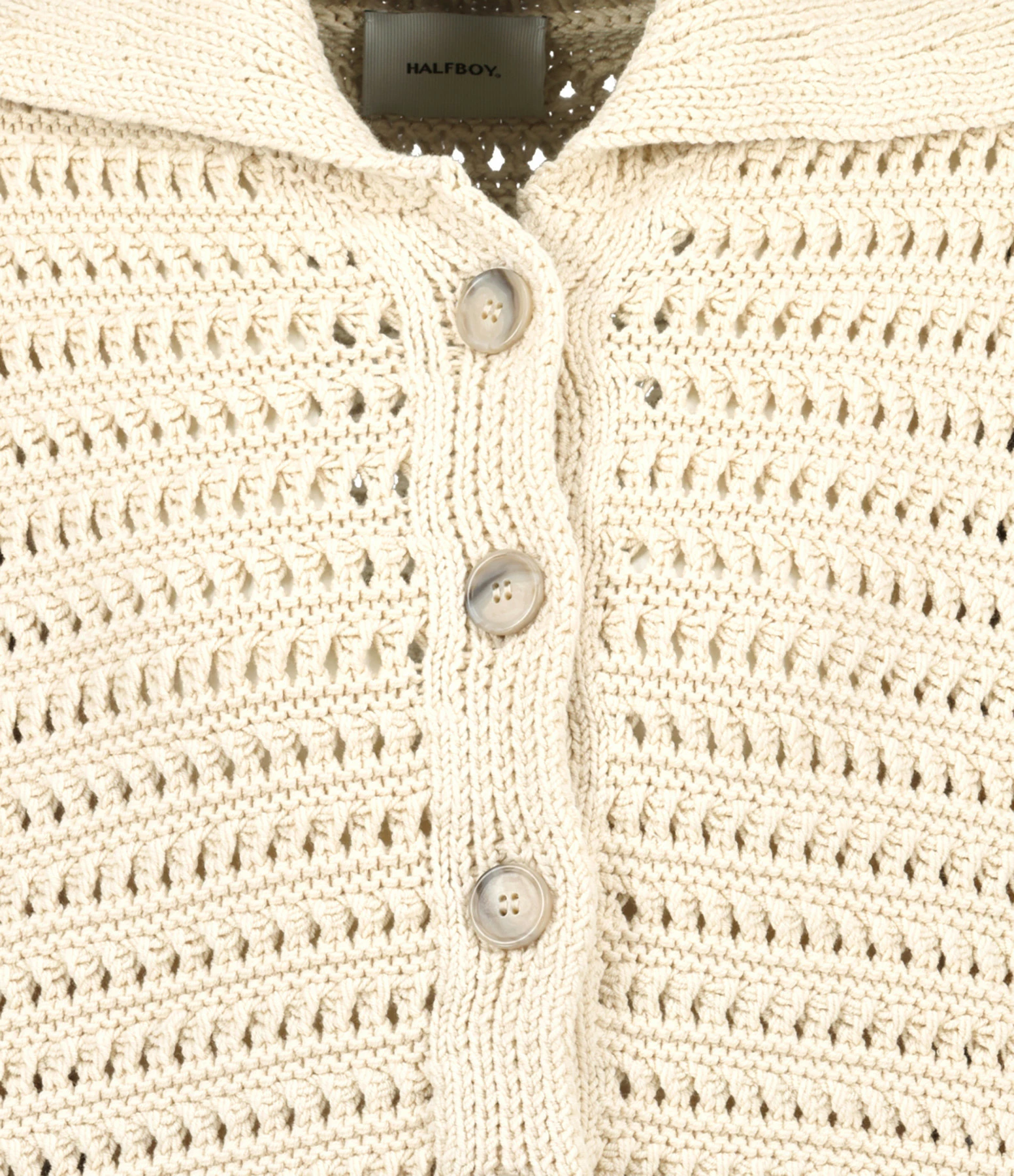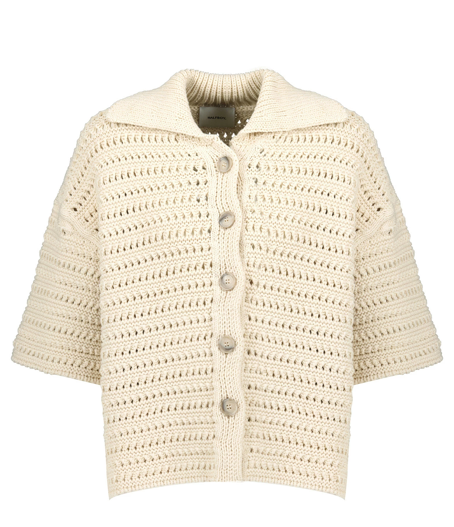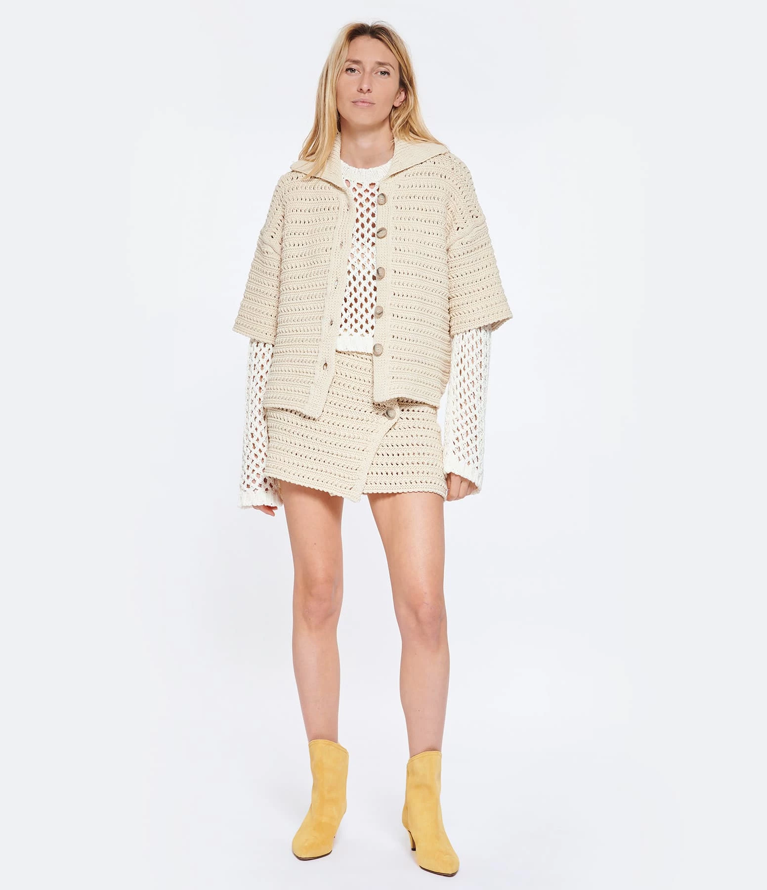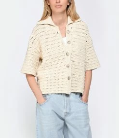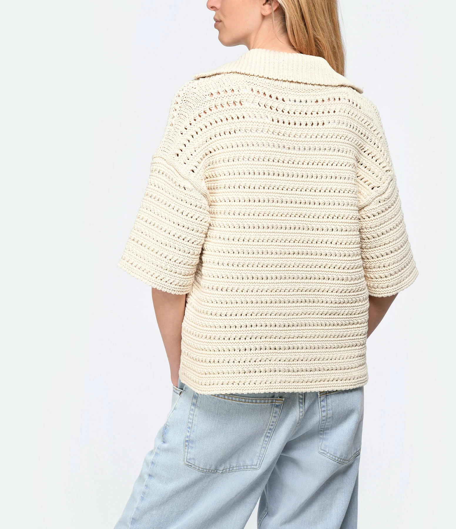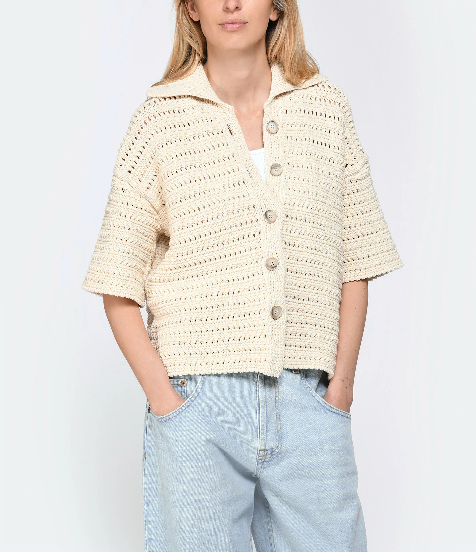 Chemise en coton effet crochet beige. Manches courtes. Col chemisier. Fermeture par boutons effet corne sur le devant. Coupe droite. Base droite.