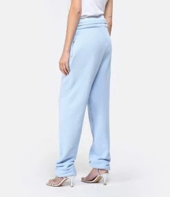 Pantalon de jogging en coton bleu. Effet caleçon blanc à rayures au niveau de la taille. Taille élastiquée avec liens de serrage. Chevilles resserrées et élastiquées. Deux poches italiennes. Non doublé.