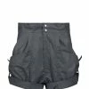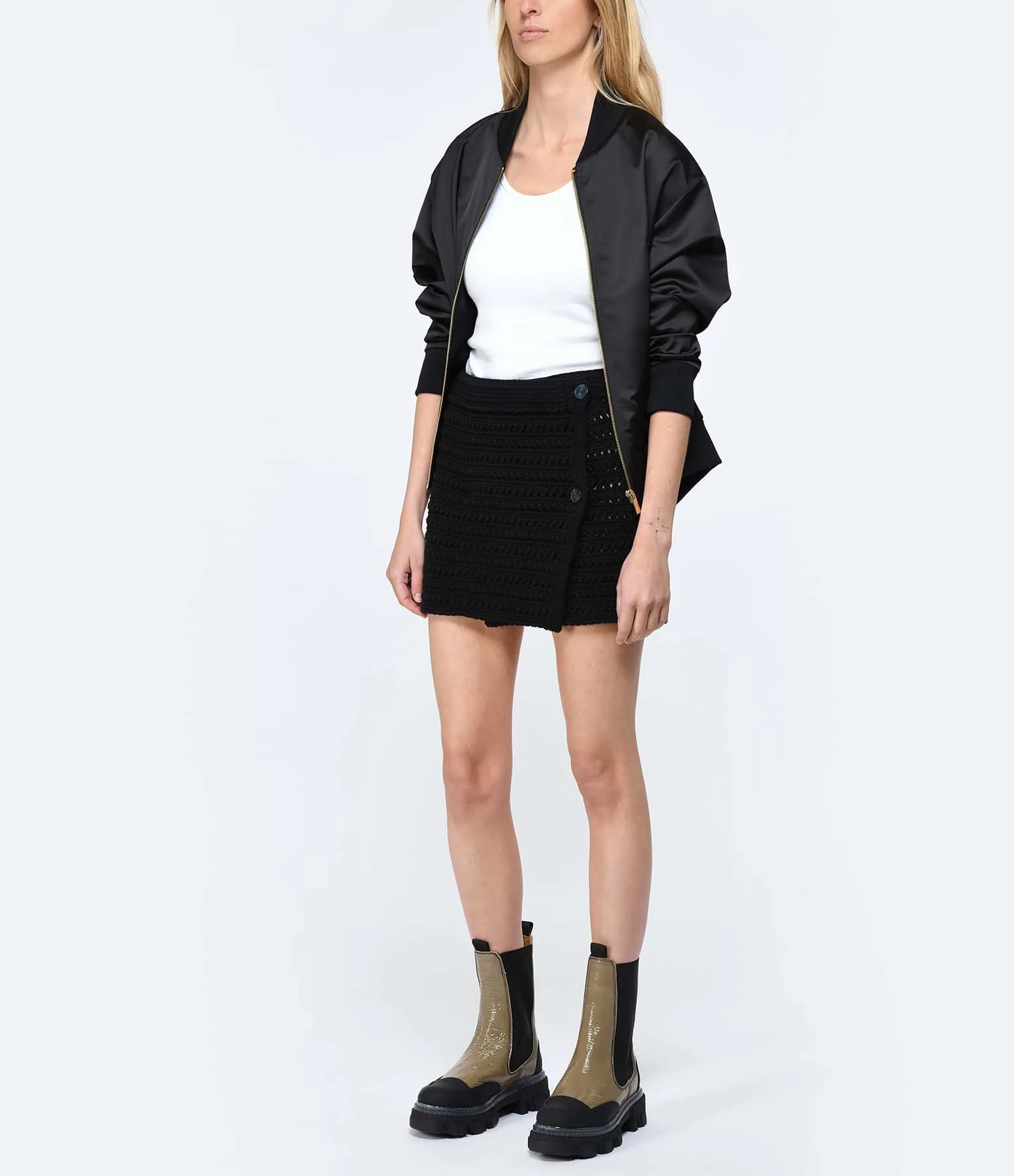 Jupe courte en coton effet crochet noir. Fermeture portefeuille par boutons noirs sur le devant. Coupe droite. Base droite.