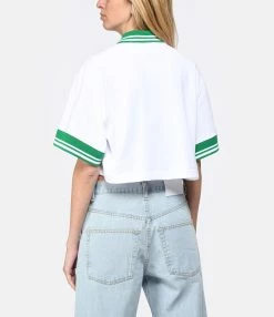 Polo court en coton blanc et vert. Inscription “halfboy” brodée en vert sur le devant côté poitrine. Col polo vert avec bandes blanches. Fermeture par boutons blancs sur le devant. Manches courtes. Coupe droite. Base droite.