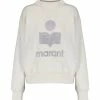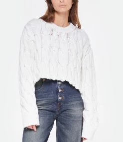 Pull en maille torsadée en laine mélangée blanc. Col rond côtelé. Manches longues avec poignets côtelés. Coupe ample. Longueur racourccie. Base droite.