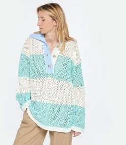 Pull en maille torsadée en laine mélangée blanc. Col rond côtelé. Manches longues avec poignets côtelés. Coupe ample. Longueur racourccie. Base droite.