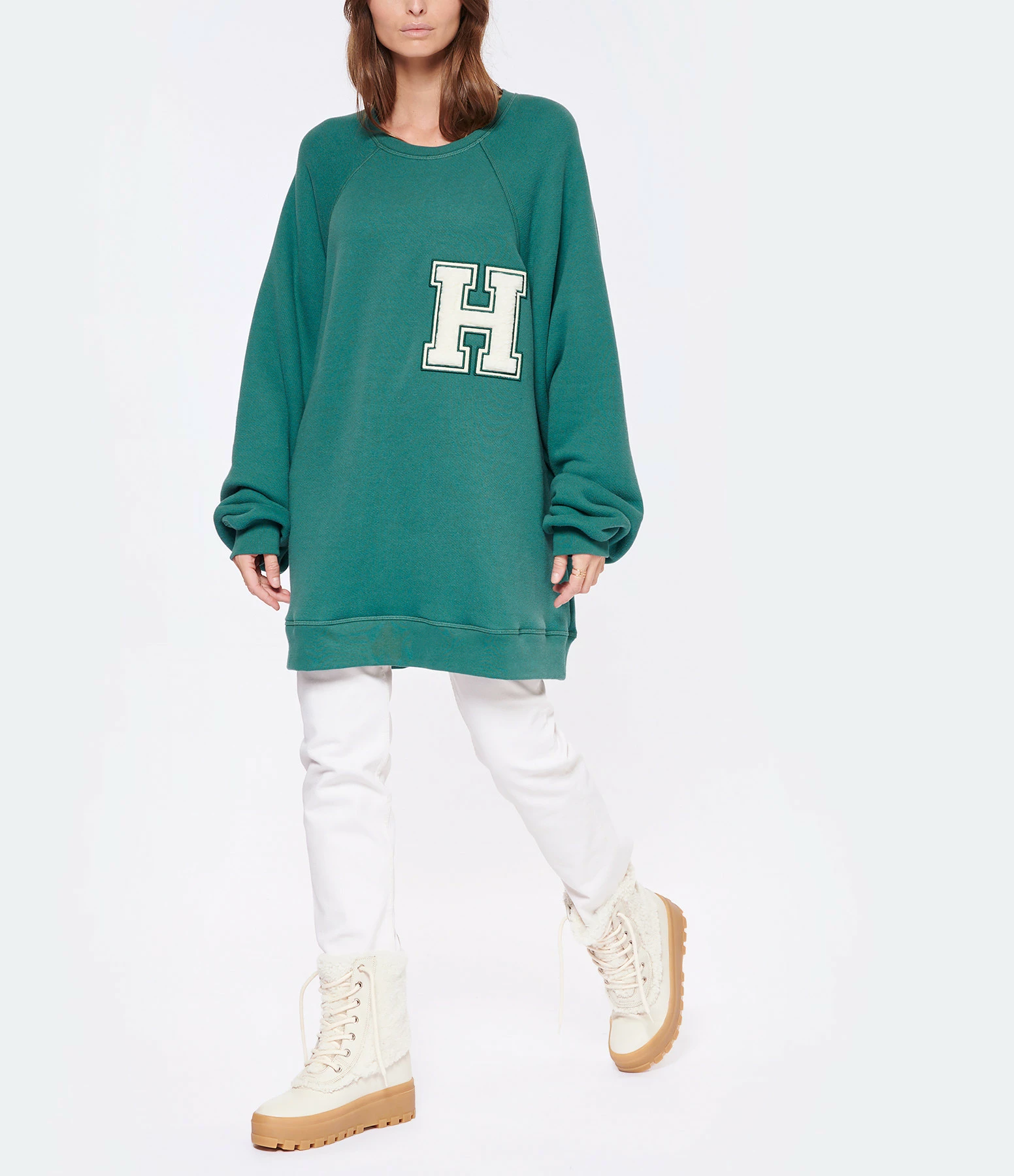 Sweatshirt molletonné en coton mélangé vert avec logo brodé en blanc en tissu éponge sur la poitrine. Col rond côtelé. Manches longues raglan avec poignets côtelés. Coupe oversized. Base droite côtelée.