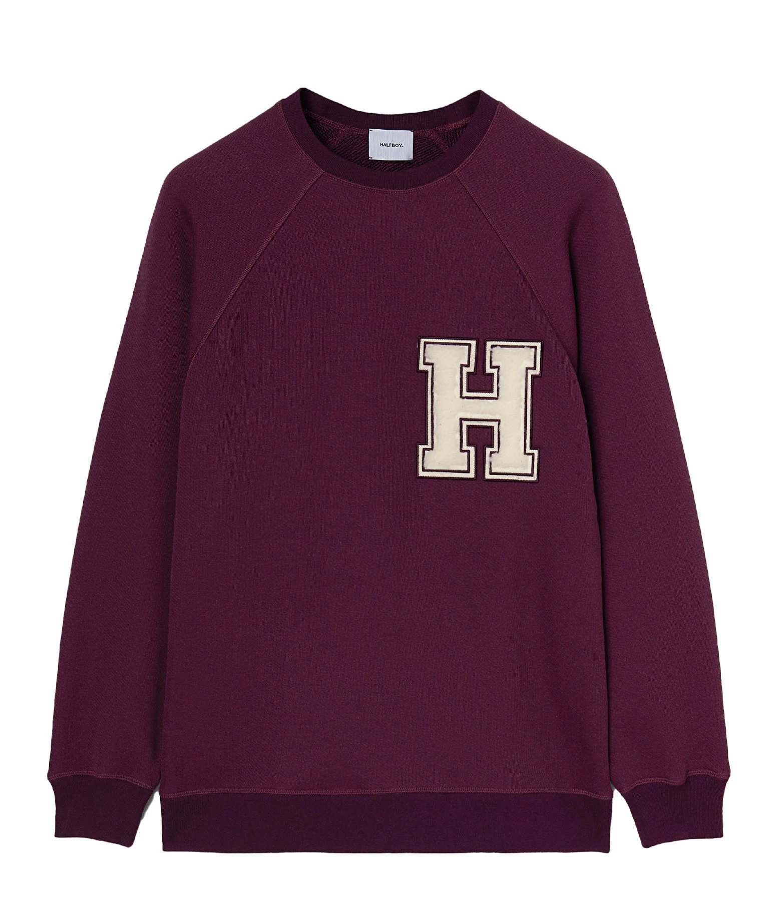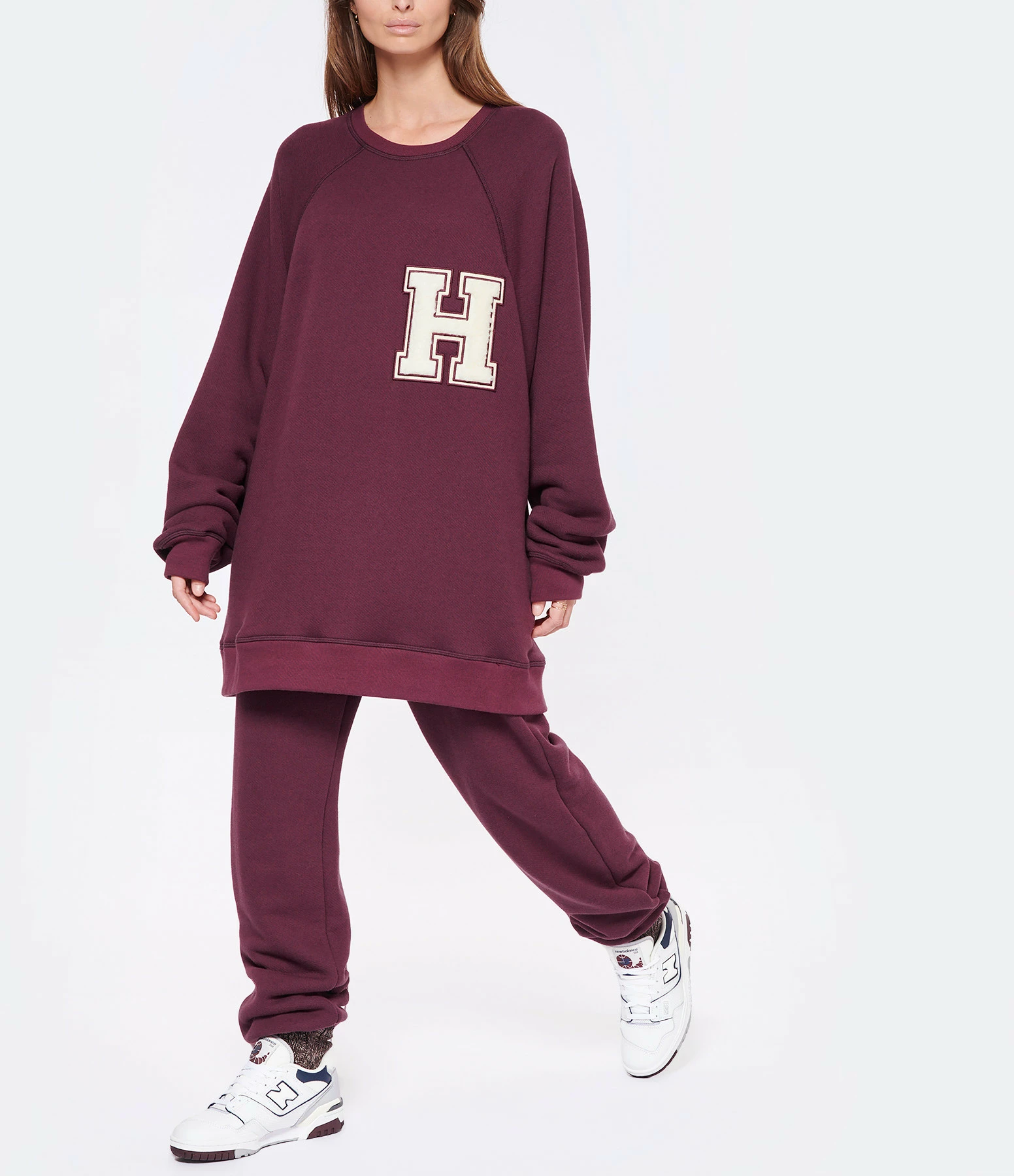 Sweatshirt molletonné en coton mélangé violet avec logo brodé en blanc en tissu éponge sur la poitrine. Col rond côtelé. Manches longues raglan avec poignets côtelés. Coupe oversized. Base droite côtelée.