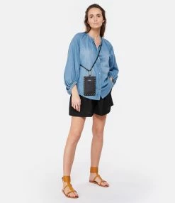 Blouse en denim de coton bleu. Col rond froncé. Fermeture par boutons sur le devant. Manches longues avec poignets resserrés. Coupe droite. Base arrondie.