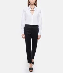 Chemise en coton blanc. Col italien. Manches longues avec boutons aux poignet. Coupe droite. Base arrondie plus courte à l’avant.