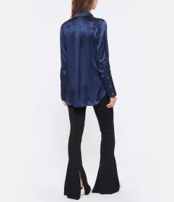 Chemise en soie bleu nuit. Double col chemisier. Manches longues avec poignets boutonnés. Fermeture boutonnée sur le devant. Coupe droite. Base arrondie plus longue à l’arrière.