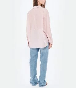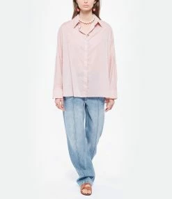 Chemise fluide en coton à fine rayures roses. Manches longues chauve souris avec boutons aux poignets. Col chemise. Fermeture à bouton nacré gris. Coupe ample. Base droite avec côté arrondis, plus courte à l’avant. Non Doublé.