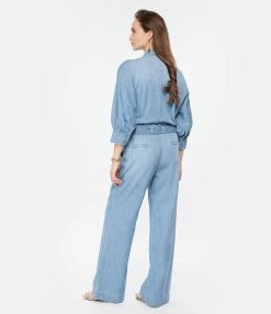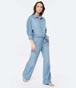 Combinaison pantalon en denim de coton bleu ceinturée. Fermeture par boutons sur le devant. Col chemisier. Manches longues resserrées aux poignets. Quatre poches. Coupe droite. Base droite.