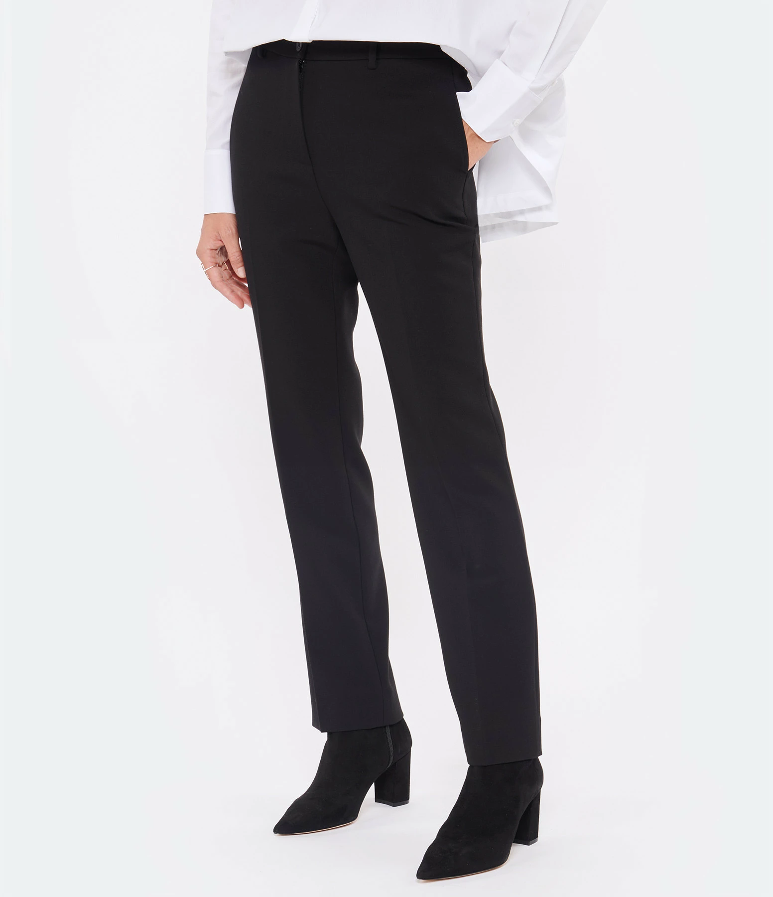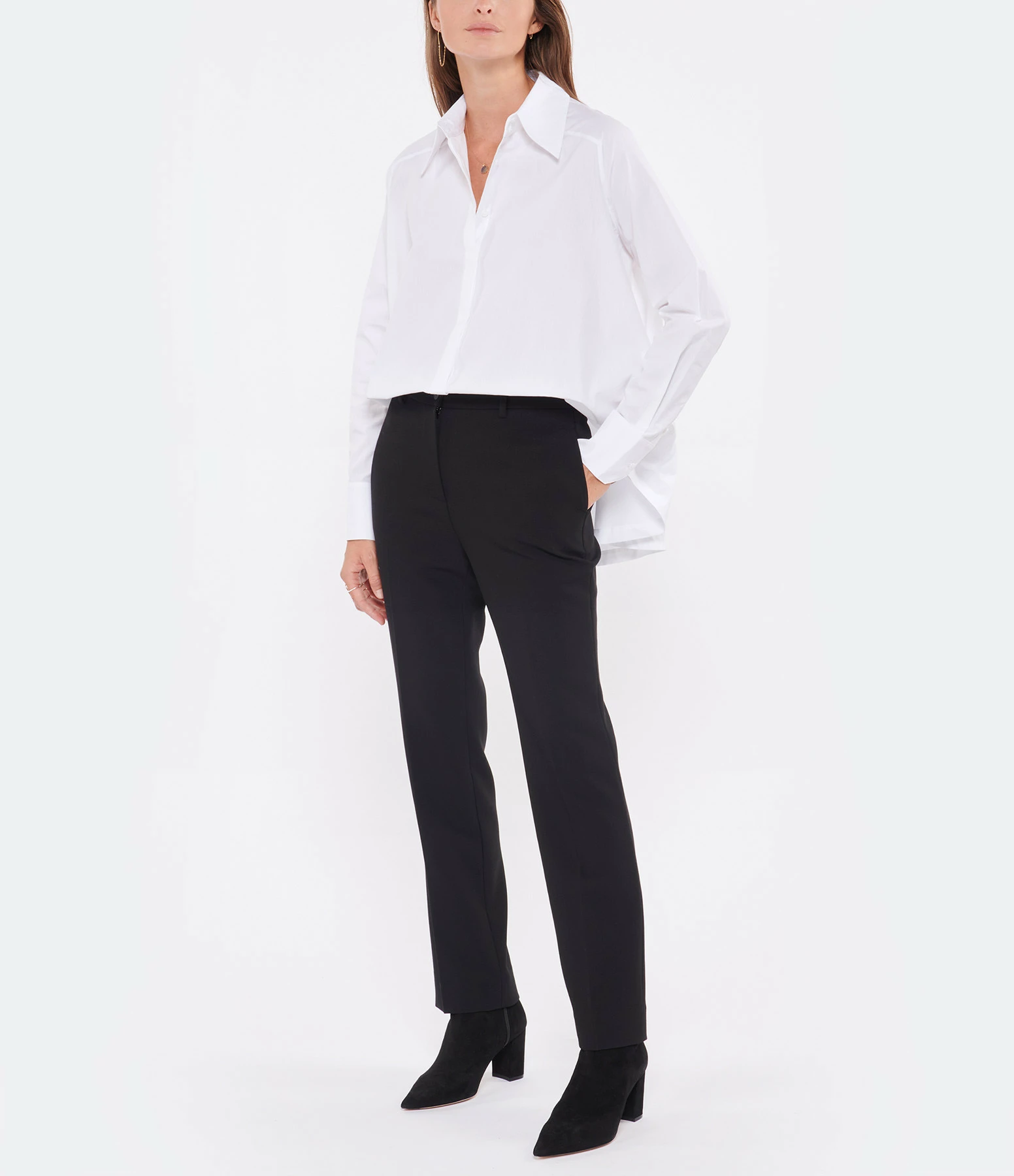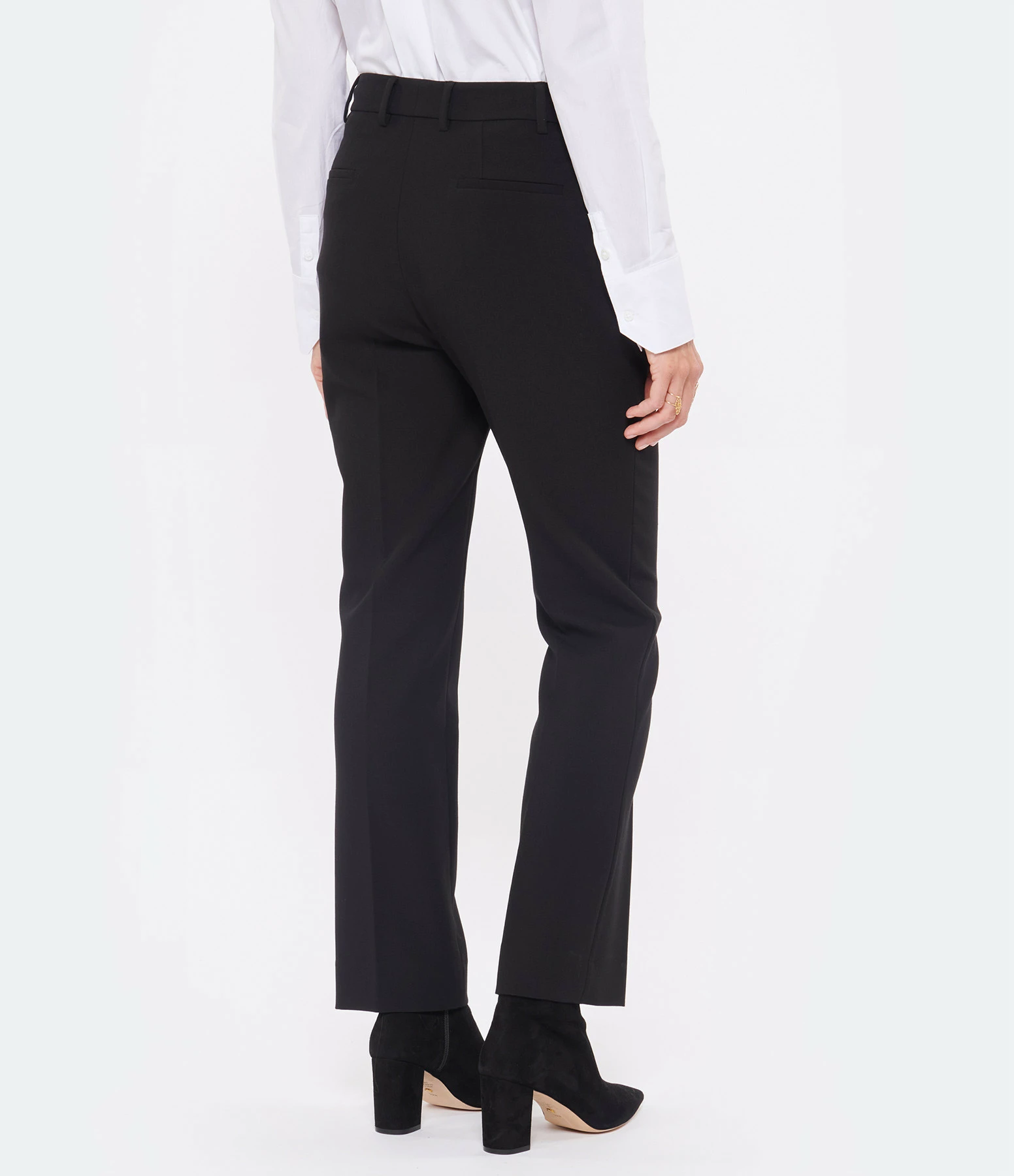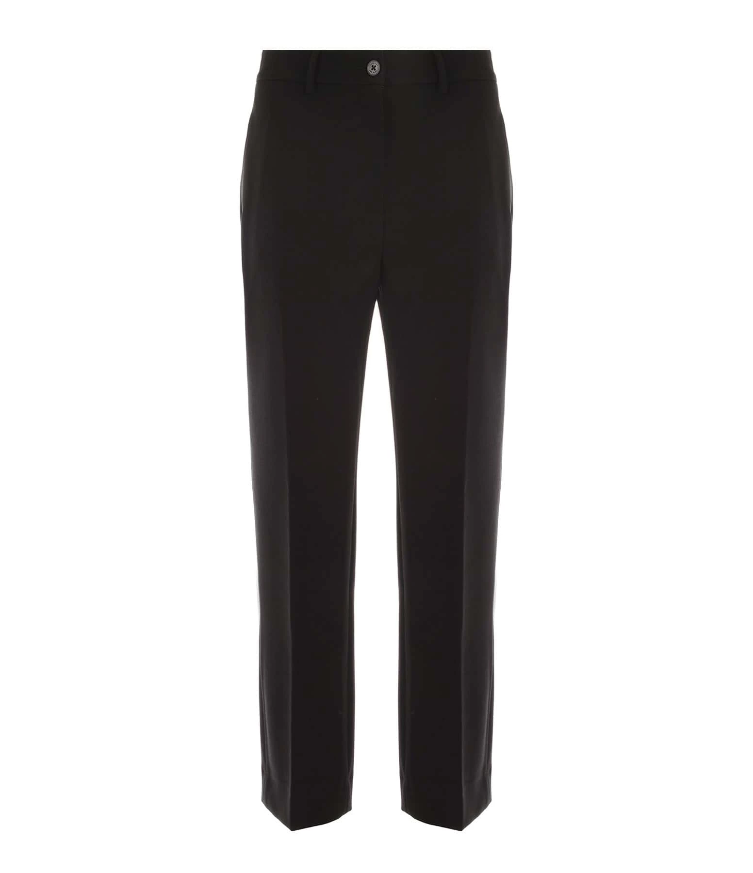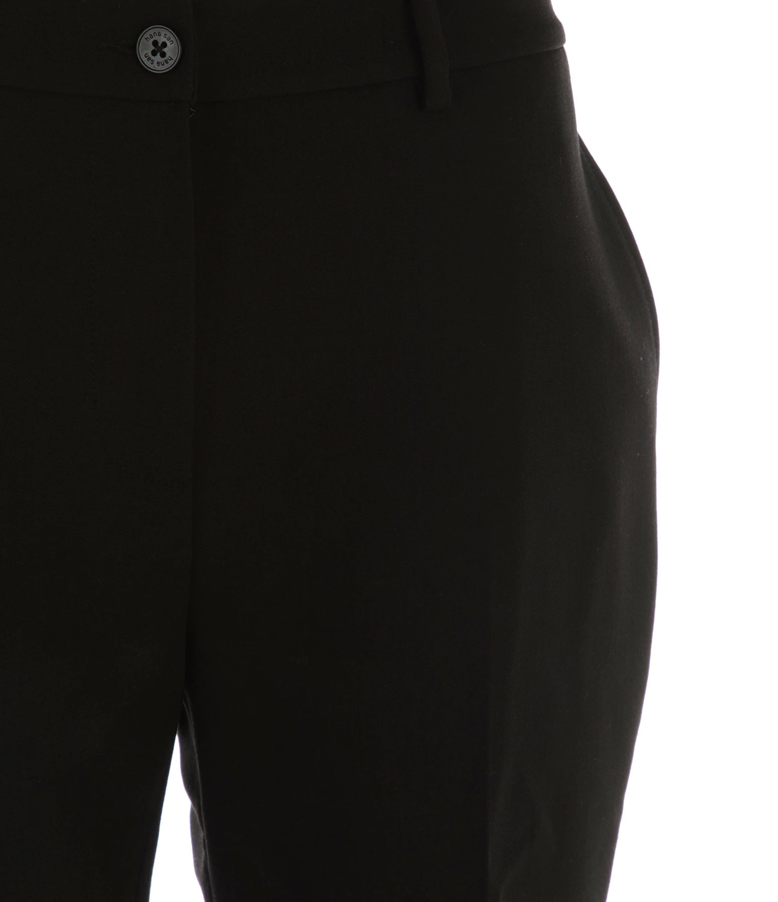 Pantalon tailleur à pinces noir. Passants pour ceinture. Fermeture zippée sous la braguette et boutonnée. Bouton noir avec logo. Deux poches italiennes sur le devant. Deux fausses poches passepoilées dans le dos. Coupe droite. Base droite.