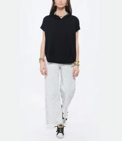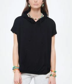 Pull manches courtes en coton noir. Capuche avec liens de serrage. Une poche kangourou à l’avant. Coupe droite. Base arrondie.