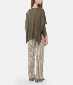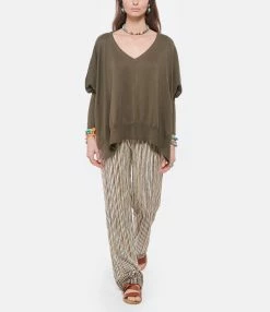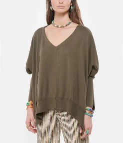 Pull ample en coton kaki. Col V. Manches 3/4 effet chauve souris, resserrées aux poignets. Coupe oversize. Fentes de 30 cm sur les côtés. Base droite.