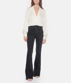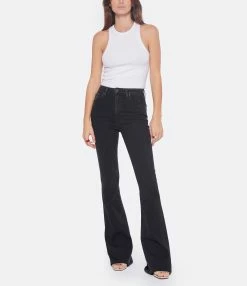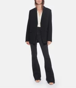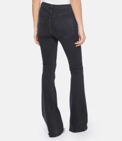 Pantalon en denim de coton stretch noir. Taille haute avec passants pour ceinture. Braguette zippée et bouton. Bouton métallique noir. Deux poches italiennes et une poche à gousset. Deux poches plaquées dans le dos. Coupe flare. Base droite.