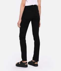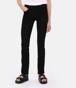 Pantalon en denim de coton mélangé noir. Taille mi-haute avec passants pour ceinture. Braguette zippée et bouton métallique noir. Deux poches italiennes et une poche à gousset. Deux poches plaquées dans le dos. Coupe slim. Base droite.