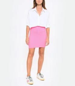 Mini-jupe en crépon extensible rose. Sans couture. Coupe près du corps. Base droite. Non doublée.