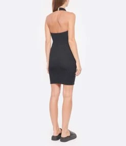 Robe courte en crépon extensible noir. Encolure halter. Dos échancré avec fermoir crochet doré au niveau de la nuque. Sans manches. Coupe près du corps. Base droite. Non doublée.