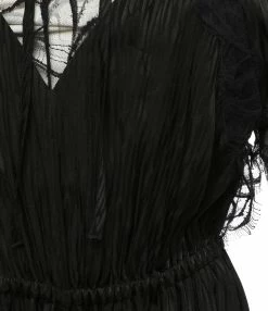 Combinaison short noire à manches courtes. Imprimé animal ton sur ton. Décolleté et bord des manches en dentelle. Dos nu. Taille élastiquée avec cordon de serrage. Coupe droite. Base droite.
