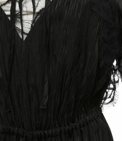 Combinaison short noire à manches courtes. Imprimé animal ton sur ton. Décolleté et bord des manches en dentelle. Dos nu. Taille élastiquée avec cordon de serrage. Coupe droite. Base droite.