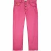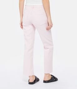 Jean en denim rose clair. Bords francs. Taille haute. Cinq poches. Fermeture par zip et bouton. Coupe droite.