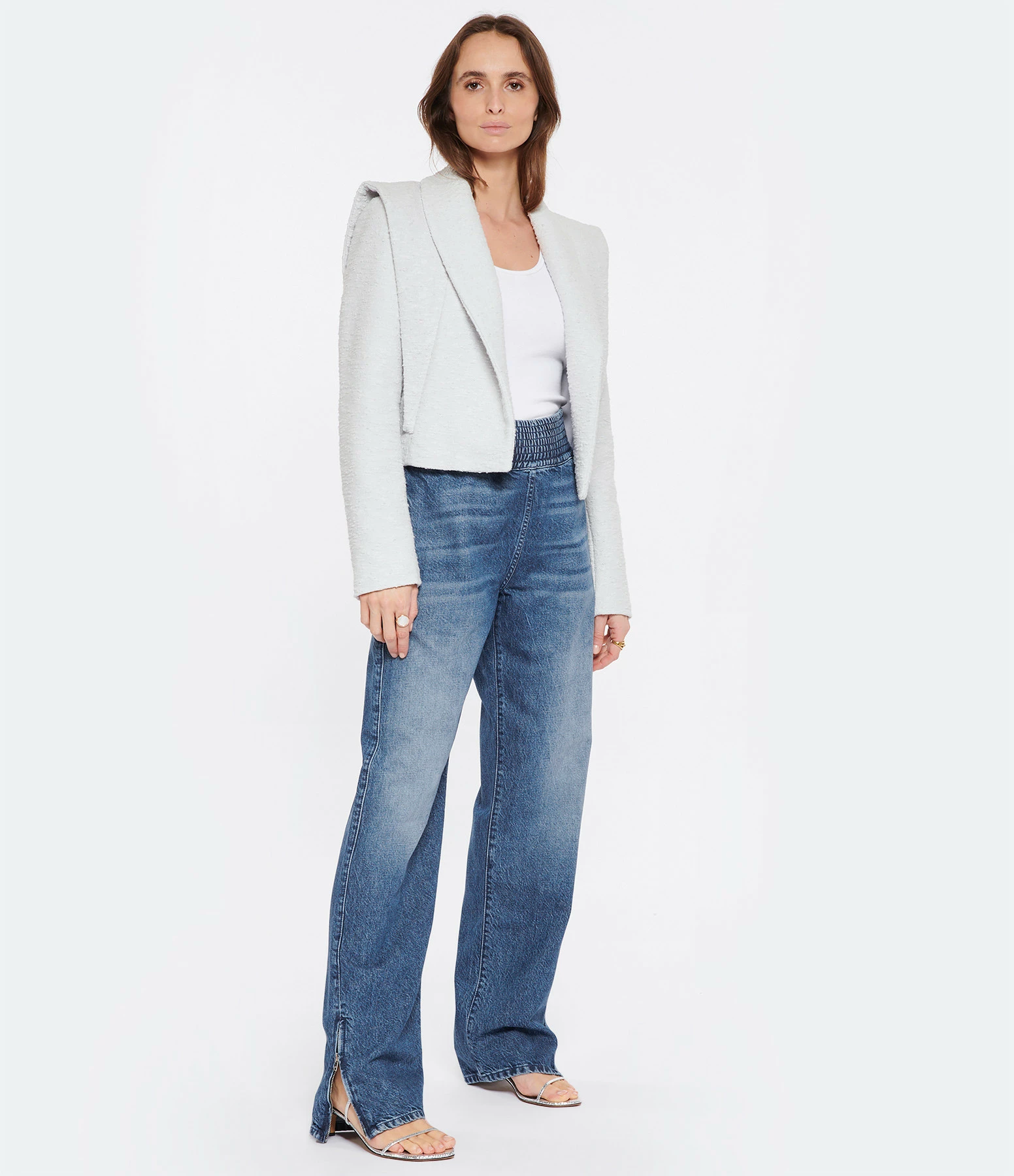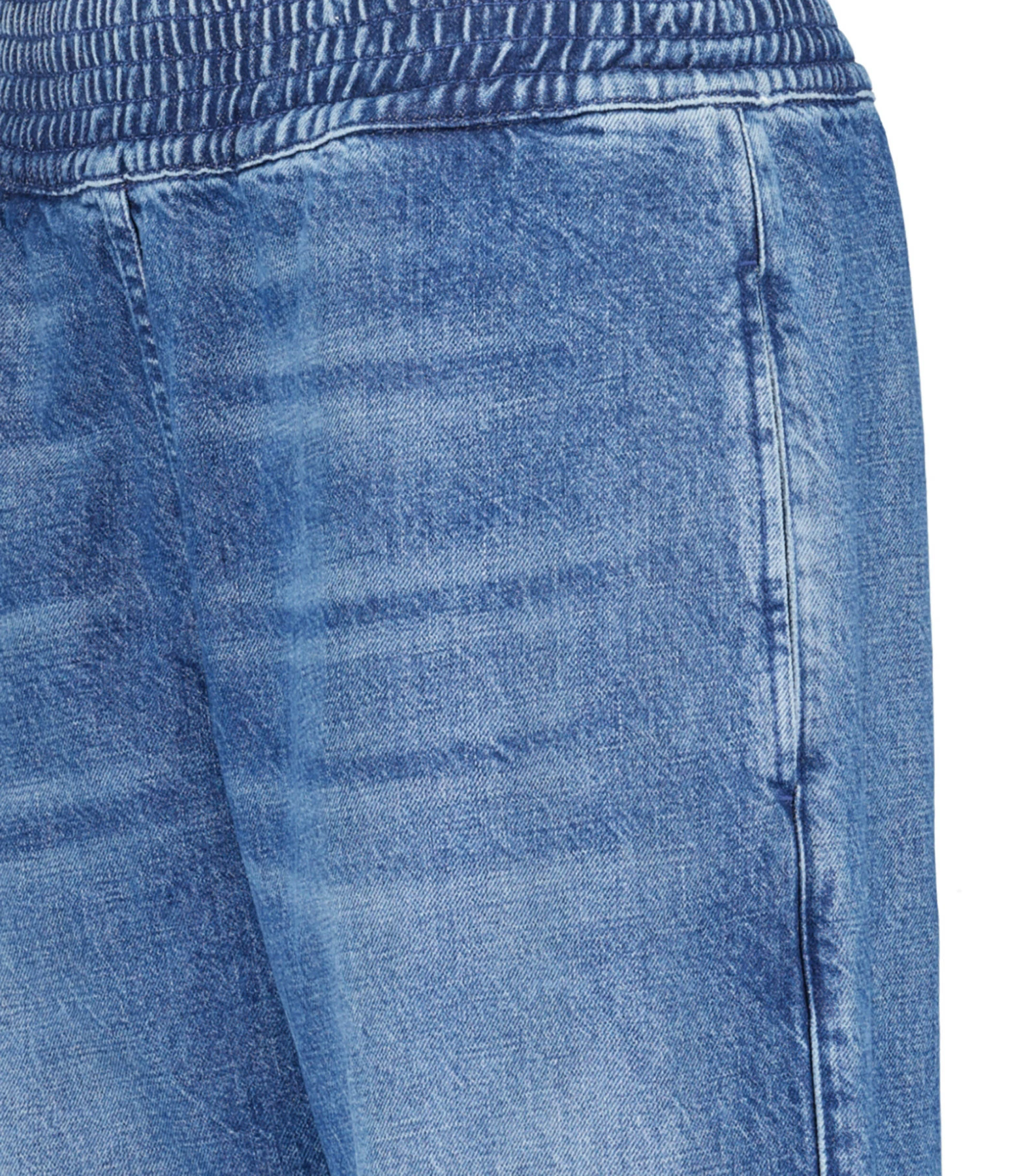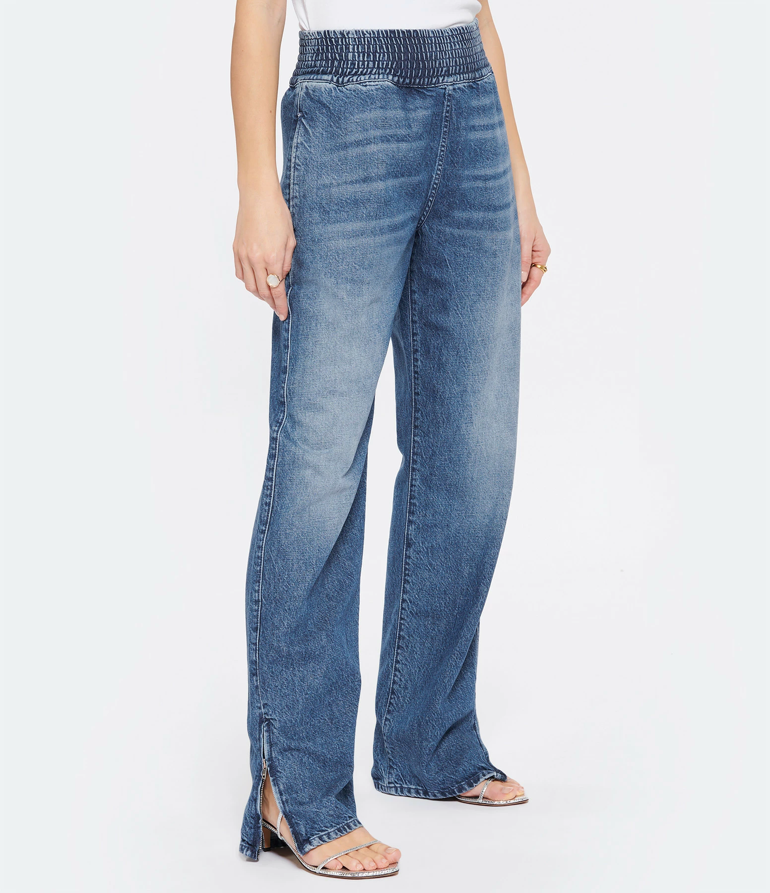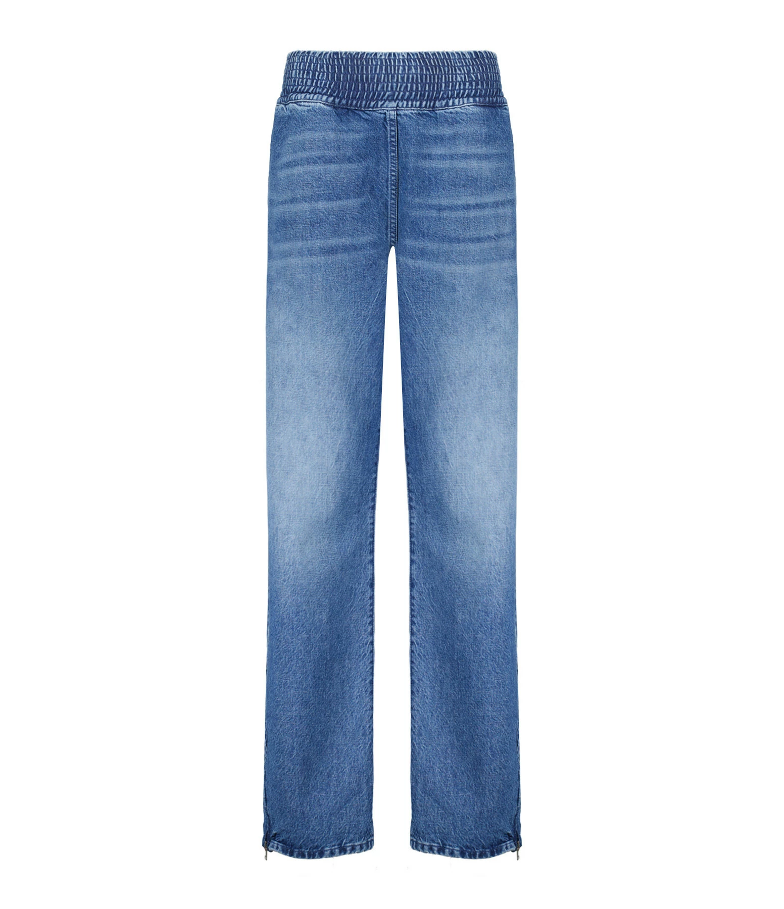 Jean large en denim de coton bleu délavé. Taille haute élastiquée. Deux poches à l’avant prises dans la couture latérale. Zip latérale extérieur aux chevilles. Coupe droite. Base droite.