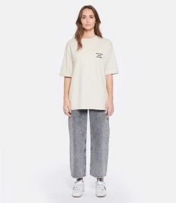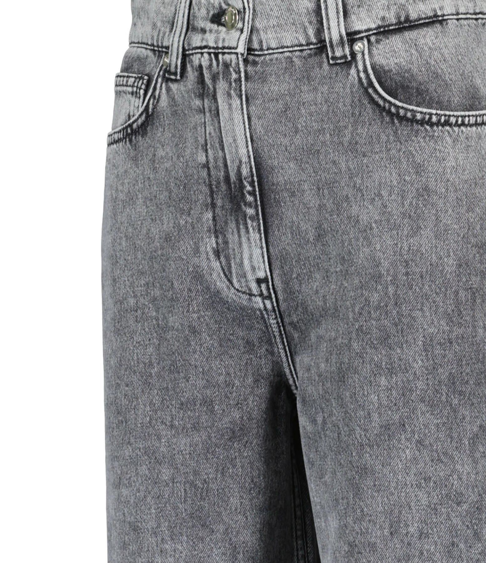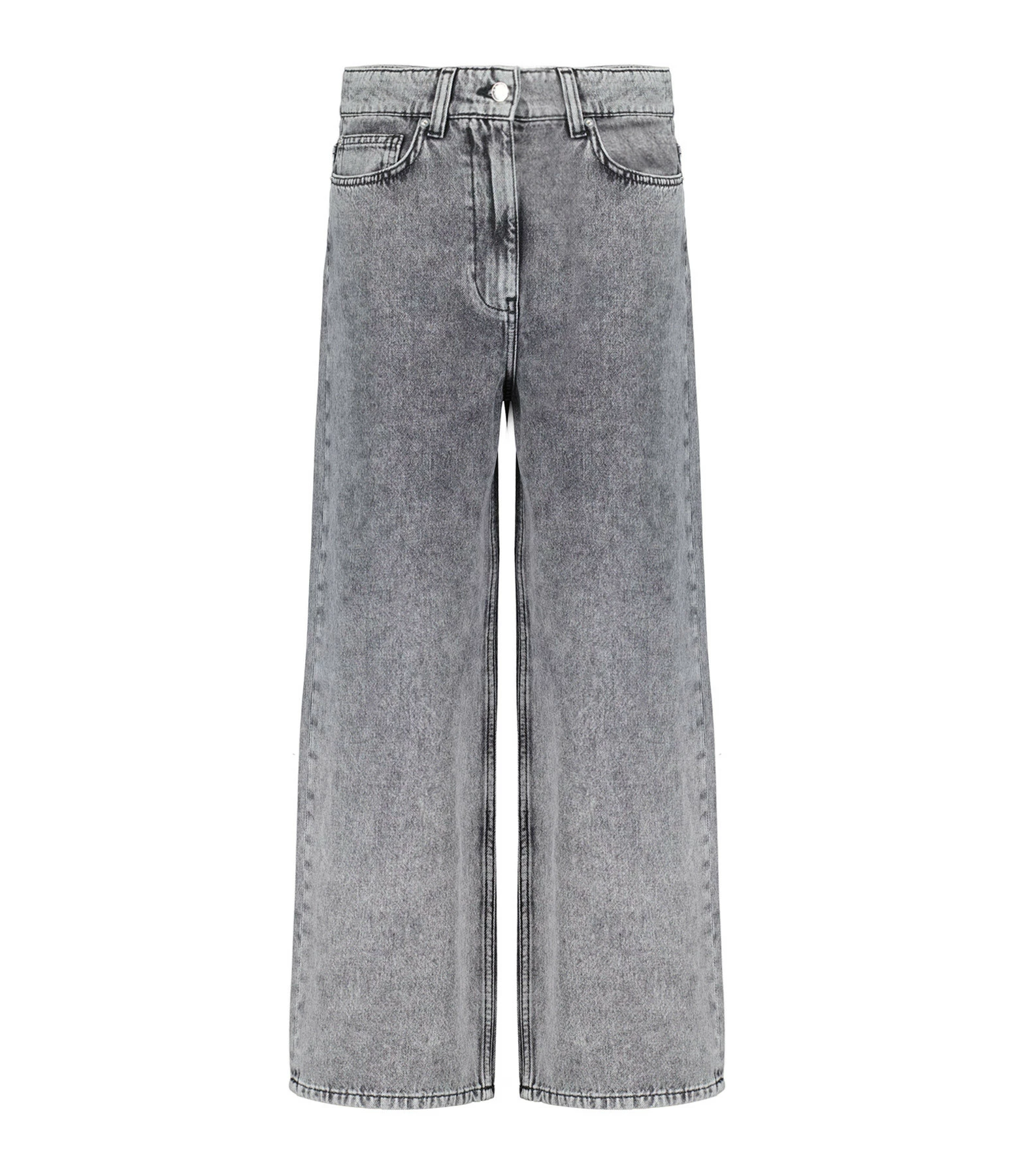 Pantalon large en denim de coton gris délavé. Taille haute avec passants pour ceinture. Braguette zippée et boutonnée. Cinq poches. Coupe droite. Base droite.