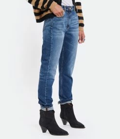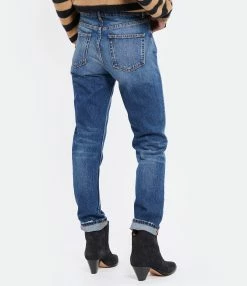 Pantalon en denim de coton bleu foncé délavé. Taille haute avec passants pour ceinture. Braguette zippée et boutonnée. Boutons et rivets métalliques argentés. Deux poches italiennes et une poche à gousset. Deux poches plaquées dans le dos. Coupe slim. Base droite avec effet usé.