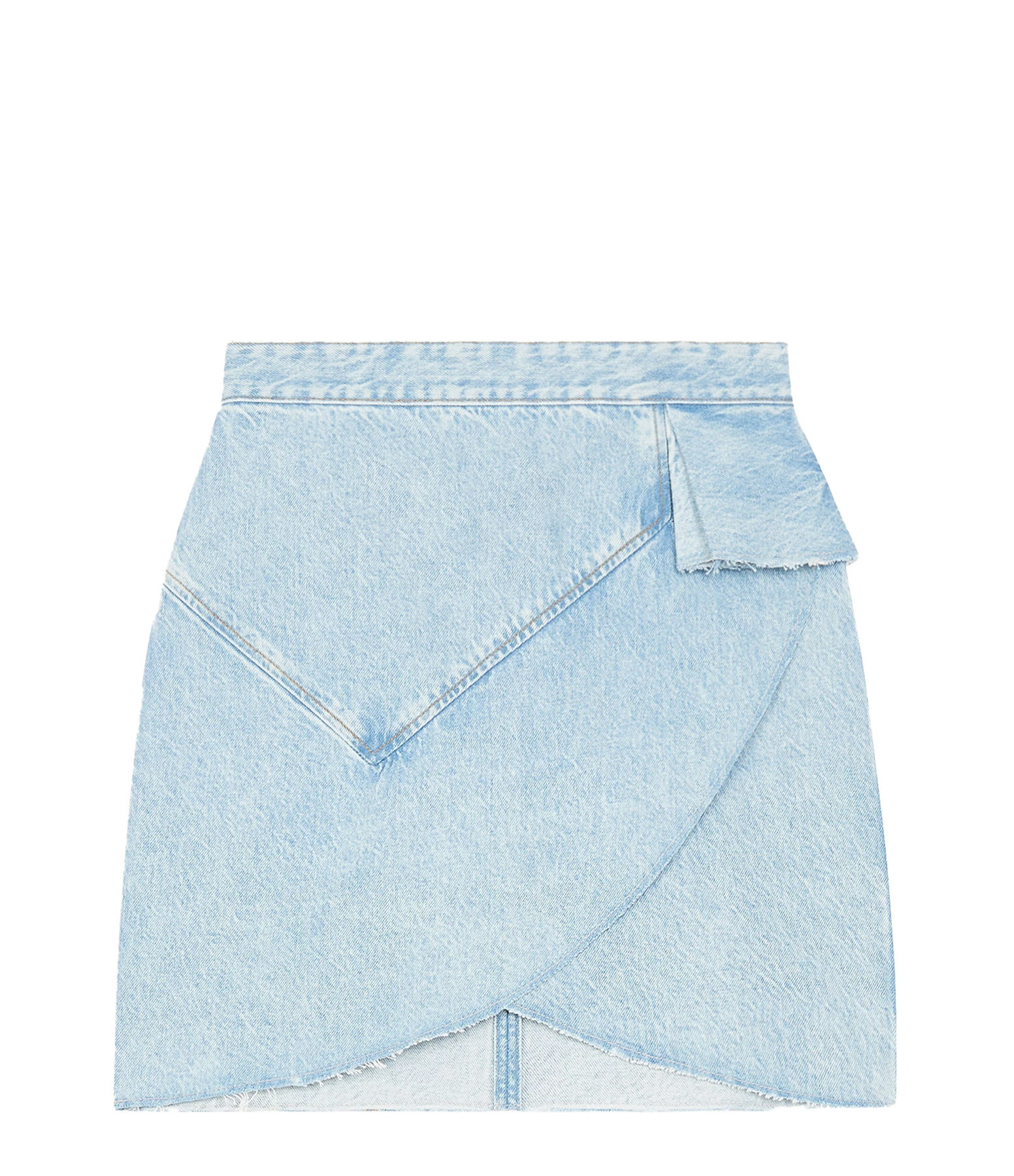 Jupe courte en denim de coton bleu clair. Effet portefeuille sur le devant. Fermeture zippée à l’arrière. Coupe droite. Base asymétrique coupée à cru.