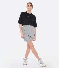 Jupe courte grise froncée côté droit. Coupe ajustée et détails de drapés.