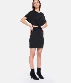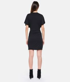 Robe courte noire avec un nœud à l’avant au niveau du ventre. Plissée au niveau des hanches. Col rond. Manches courtes. Coupe droite. Base droite.