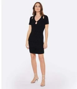 Robe courte en maille côtelée noire réhaussée de fils métallisés argentés créant un effet pailleté. Encolure en V avec détails. Manches courtes avec détails. Fronces sur les deux côtés de la jupe. Coupe près du corps. Doublée.