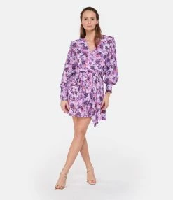 Robe courte à imprimé violet. Manches longues et poignets boutonnés. Epaulettes. Décolleté en V. Volants au niveau de la jupe. Fermeture zippée invisible latérale. Coupe droite. Base asymétrique. Doublée.