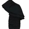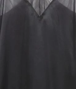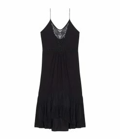 Robe mi-longue en soie noire à fines bretelles. Détails de perles brodées sur le devant et jeu de transparence au niveau du buste. Volants sur le bas. Coupe droite. Base asymétrique. Doublée.