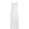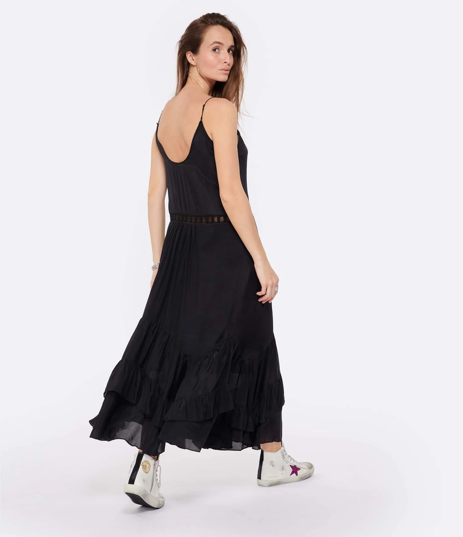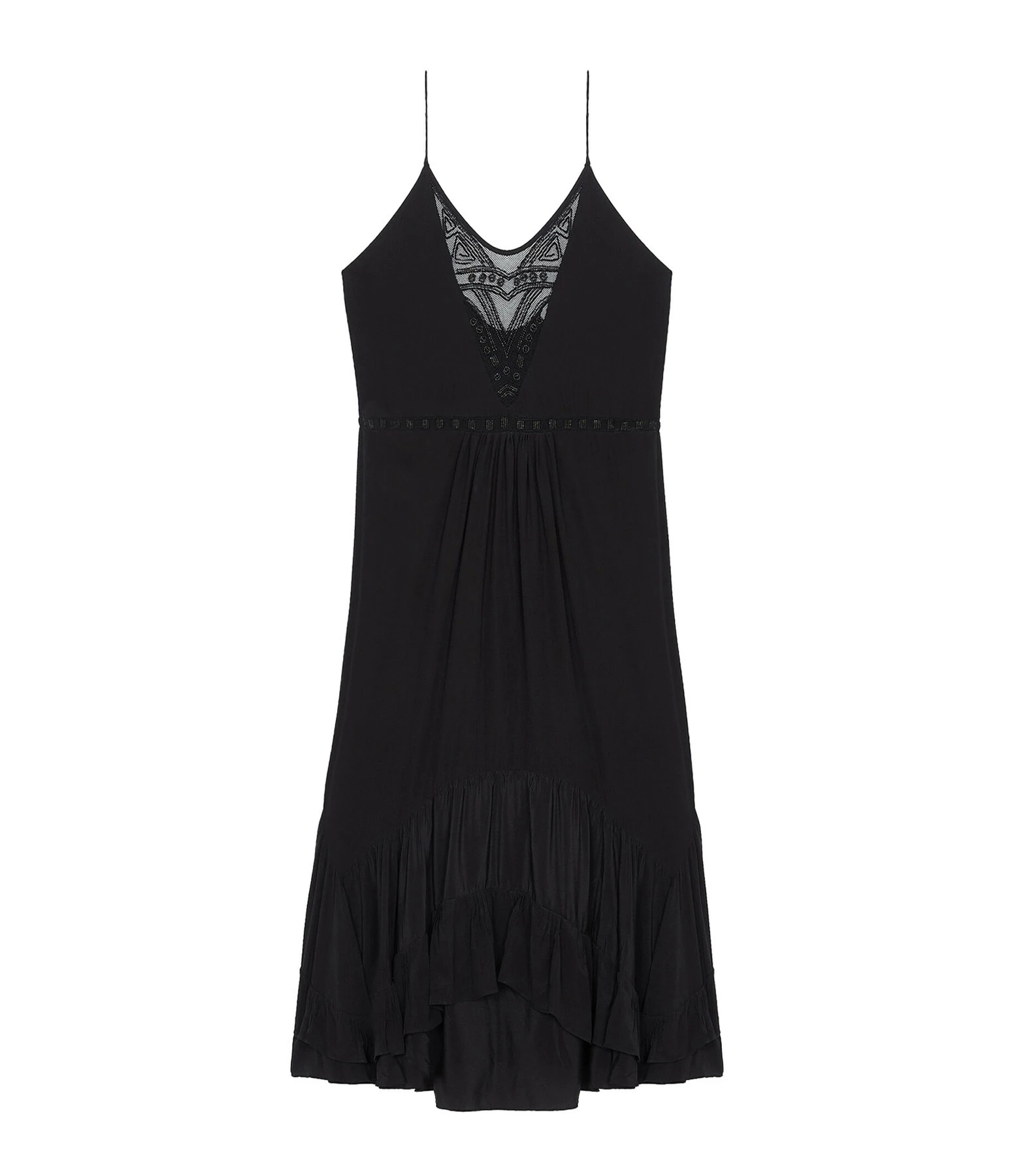 Robe mi-longue en soie noire à fines bretelles. Détails de perles brodées sur le devant et jeu de transparence au niveau du buste. Volants sur le bas. Coupe droite. Base asymétrique. Doublée.