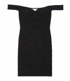 Robe courte noire. Matière texturée. Épaules dénudées. Col légèrement en V. Coupe ajustée.