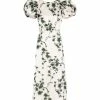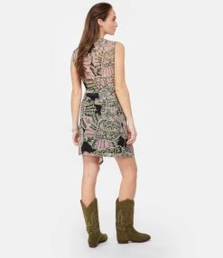 Robe courte en soie à imprimé dans les tons verts. Encolure cache-cœur. Jupe drapée. Sans manches. Fermeture zippée invisible latérale. Coupe droite. Base asymétrique.